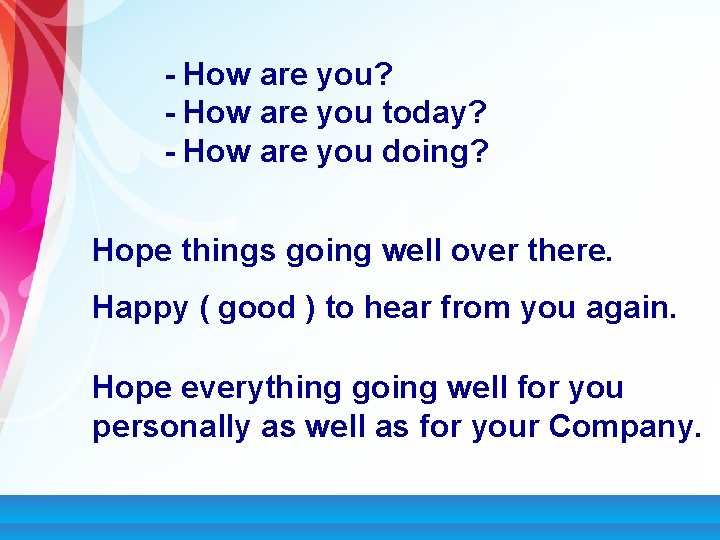 Hope things are going well. I hope youre having a great week. Hope things are going well with you or Hope everything is going well for you. Hope this finds you well.